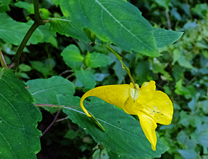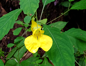 | キツリフネ:ツリフネソウ科 この黄色花は、少なかった 紫花のツリフネソウの方が多かった 黄色花の方が早く咲き始めるようである なるほど、葉っぱの下に咲いているね |