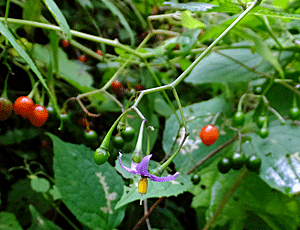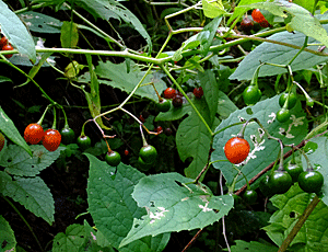 | ヤマホロシ:ナス科 ヒヨドリジョウゴかと思ったが 調べてみると、ヒヨドリジョウゴは『茎に毛が多く、花は白色』・・・と これは茎に毛が無いので、ヤマノホロシらしい 緑は若い実 熟してくると赤くなる 変わった名前だと思って調べたら 『山を滅ぼすほどの生育力がある』からだって が、「不明」と言われている説もある |