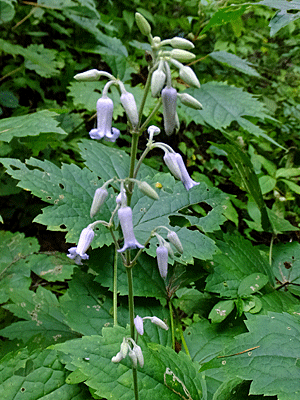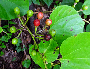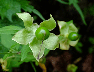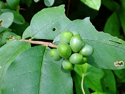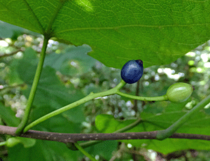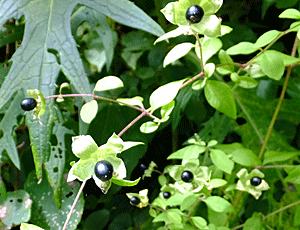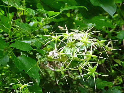 | ウリノキ:ミズキ科 葉の裏に花が咲くので、 大きな葉っぱを持ち上げないと見つけられない 藍色の実と緑色の実があった |