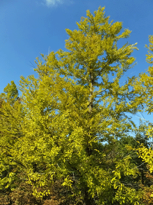 | メタセコイア:ヒノキ科 これも、黄葉が始まっていた 右 葉っぱのアップ そっくりさんの「ヌマスギ(ラクウショウ)」という木があるが、 この2つの木は遠目で見ると同じに見える ・・・・・・ @大きな違いは、 木の根元に呼吸根と呼ばれるタケノコのような根が たくさん出ていれば、ヌマスギ(ラクウショウ) 出ていなければ、メタセコイア ・・・・・・ A 葉の付き方が違う メタセコイアは、線のように細い葉は2列に並んで対生 ↑ ヌマスギ(ラクウショウ)は、葉は2列に並んでいるが互生 |