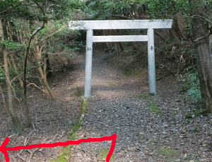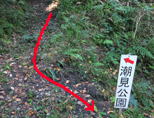 | 赤い矢印のように下り、林道に出てから振り返った 暗い道からやっと明るい道になった しかし、草がぼうぼう〜 あまり人が歩いていないらしい |