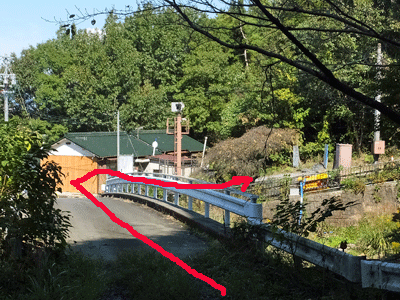 | 草の繁った林道をしばらく歩くと橋 その橋を渡って右折 |
