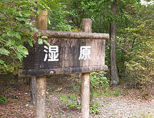 | 湿原の表示板 小さな湿っぽい場所で、「湿原」とはちょっとね・・・ この先にあった薬草園は、今は草ぼうぼうの場所になっていた |