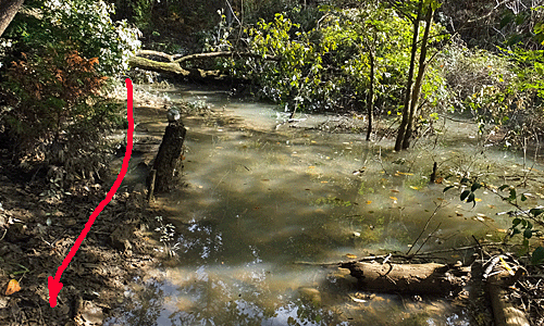 | 左 黄色線のように登った所が、堰堤の上 11:57 右 堰堤から水が流れ落ちていた すぐそばに民家がある場所 |