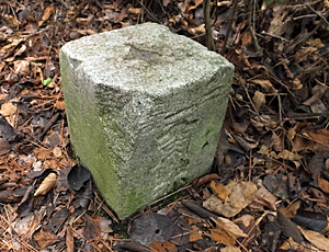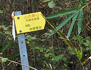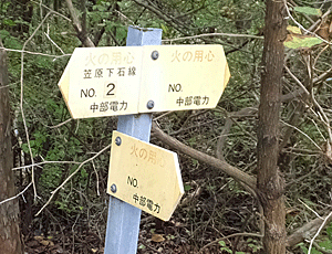 | たらたらの稜線を歩いて行くと、また鉄塔 12:41 その向こうに指標が小さく見えた 近づいてみると、「笠原下石線 No.2」は、はっきり見えるが、 ほかは文字が薄れて見えない |