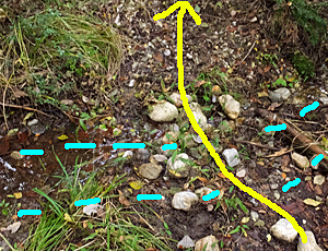 | 谷まで下りた 水色の点々の間に水が流れていた そこを渡って・・・ |