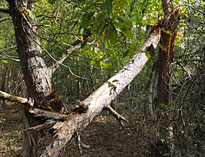 | のっけから倒木のお出迎え 以前は、地元の人の散歩道のようになっていたのだが・・・ |