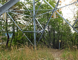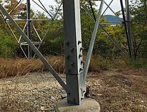 | 大きな鉄塔 12:21 鉄塔の足に腰かけて休憩 その前に、文字の薄れた中電の指標 「大畑分岐線」や「No.3」「No.1,2」の文字が薄れていた |
