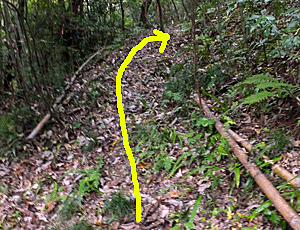 左斜面へ登って行った 以前、「この道はどこへ行くのだろう?」と 偵察済みの道 =スタート地点のおりべダム駐車場に行ける |