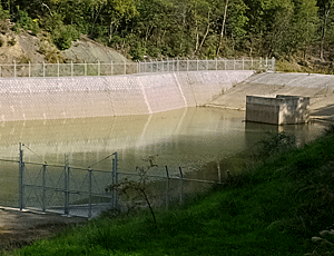| 立派な道路に降りて、堰堤を振り返った さあ、この舗装路を歩いて帰ろう〜 12:30 |