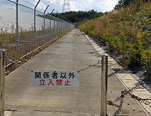 | 前方に町並みが見え、車道との合流点まで来た 12:46 チェーンをまたいで出て振り返ると、 白い板に、「 「危ないから入ってはいけません 多治見市水道部」と書いてあった |