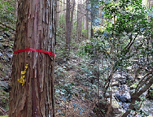↑ こういう木に巻き付けてあるテープは、12:17 登山者用とは限らないので要注意 林業関係も多いから 薄い踏み跡だけを頼りに歩いて行った |