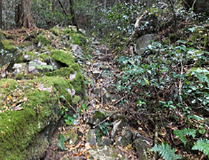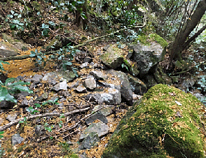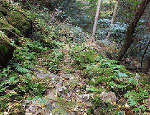 | 前方を見ると、 どう考えても私の足では無理な場所があった 右側の斜面を無理無理登ると、 おや、踏み跡らしき石の階段風が見えた ↑ |