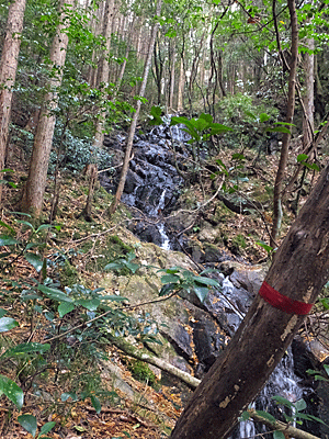 その後も踏み跡は薄かったが 一応赤テープはあった・・・ 12:32 地理院地図を見ると、沢は二手に分かれている ここがその分岐らしく大きな滝が右から流れ落ちていた 右へ行った方が地図上では「深山」に近いが こんな急でガラガラの所はイヤ! 安全そうな道はあるか?と探しても 見つからず・・・ 左の沢沿いに行くことにした |