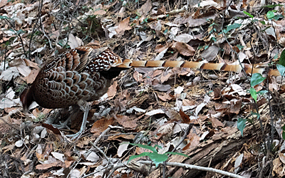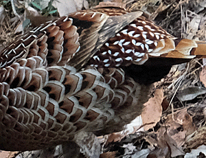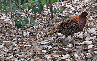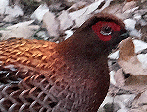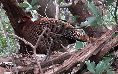 | しばらく行くと(ここの登りは今日2番目にきつい登り) あれ?またヤマドリだ! さっきのヤマドリにしては尾がうんと長い えっ、2羽いるの?? きつい登りをハーハー言いながら人間が登っているのに このヤマドリ、足が短いのに 木の葉や倒木が邪魔している所を すいすいと登ってきて、 いつの間にか追い越して前方を歩いている どこまでついてくるの? もう、そろそろ帰った方がいいんじゃないの・・・ と思うほど、すぐ傍まで来て並行して歩いていた ↑ 木が邪魔をしていない所で全身をパチリ 下左 目の周りが赤い 下右 尾は帯状の模様になっている こっちの方が尾が長いから、 さっきのヤマドリとは違う・・・と思った ・・・・・・・・・・・・・・・・・・ |