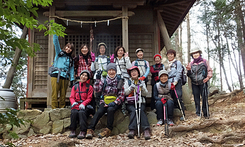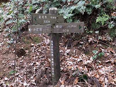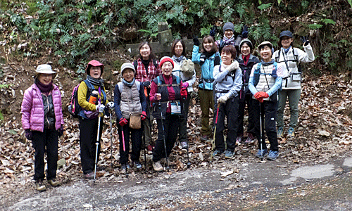 | 道樹山 13:10 ここから2つのグループに分かれて出発 「細野・楽コース」は4名(私はこっちに入った) 「山道コース」は8名の希望者 臨時のリーダーとサブリーダー(先導役と見届け役)を決めた |