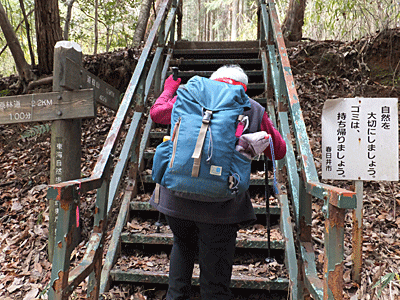 | 舗装された林道を少し歩き、 12:05 桧峠にあるこの階段を手始めに、 その先には長い長い階段が待っている その階段を利用して昼食休憩とした ⑦の集合場所 ・・・・・・・・・・・・・ 休憩中に、「道樹山からの下りを2つのグループに分けるので どちらを希望するか考えてね」と伝えた 1つは、アップダウンのある山道コース もう1つは、道樹山から真っ直ぐ「細野」に下りて行くコース 以前の記憶から、 「細野」に下りて行くコースの方が「楽」だと感じていたので アップダウンが苦手の人向けにと思ったのだが・・・ |