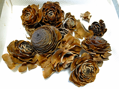 | シダーローズ(ヒマラヤスギの実):スギ科-1/26撮影 家に持って帰り、 室内で日の当たる所に置いておいた 4日後の様子 ↑ 一番大きい実は、まだローズになっていなかったが 小さめのものはきれいなローズに変わっていた |