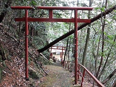 | 最奥のお社 その横に、上へあがっていく階段がある・・・ 右側は崖! 近寄らないよう枝やロープが張り巡らされていた |