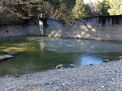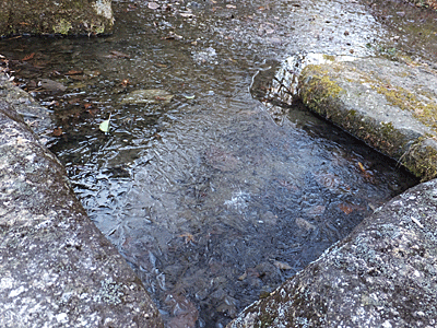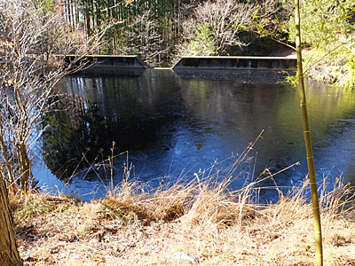 | こちらは太郎池 水はいつもと同じくらい 大きなコイが、ノ〜ロノロと泳いでいた 氷も少し張っていた |