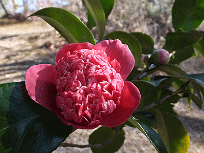 | ツバキの仲間:ツバキ科 ツバキは『日本原産』だって! 品種改良が進んでいる花で、 『日本国内だけでも2200種以上ある』とか このツバキは、中がもこもこ!で豪華に見える でも、やっぱり私はヤブツバキが好き! |