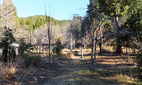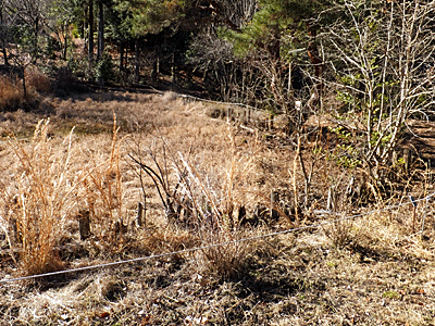 | いつもコウホネやハスが咲いている池 今は水無し 枯草とロープが張ってあるだけ この池の近くへ行くまでのイノシシ除けは 撤去されていた |