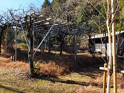 | 野草園はどうなったのだろう?と偵察に入った 藤棚はあった 鉄パイプが新しくなったような・・・ この藤棚の下も、周りも、 野草らしき囲いは無くなっていた ↓ あるのは、新しく植樹された木と それのつっかい棒 ↓ |