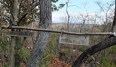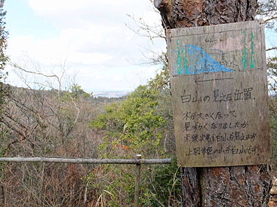 | で、山の展望は?? 遠くの白い雪山は見えず、 三角形の笠置山だけしか分からなかった・・・ |