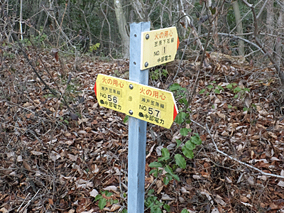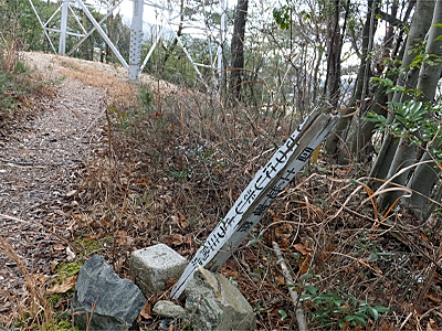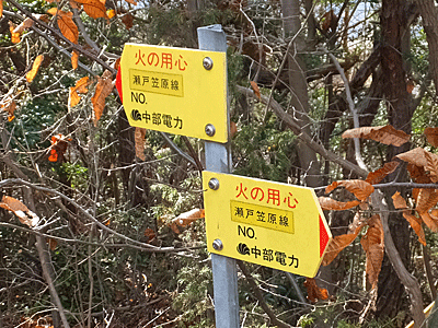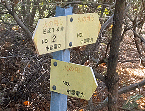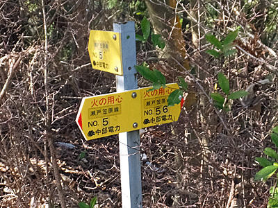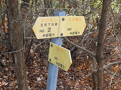 | 滝呂緑地の上の尾根を歩いて、 休憩小屋前を通って滝呂町へ下り、 芝草川を渡って、山道に入る どんどん登って尾根へ出て右折すると 鉄塔がある ↑ 頭の中の地図では、「左折」といっていたが この↓ 中電の案内板「No.2」を見て、 ハッと気づいた 「No.2」は間違い! こちらへ行っては 笠原町のグランド上の展望地へは行けない! |