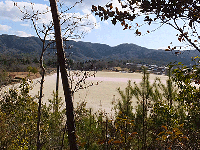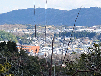 | 対面の山を登っていくと、笠原の町が見下ろせた 茶色の建物は、「モザイクタイルミュージアム」のはず いい目印になる |