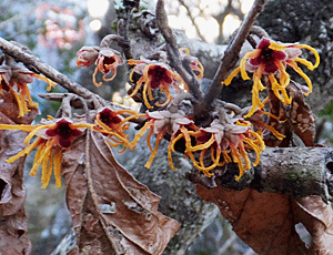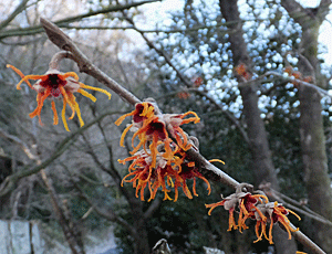 | シナマンサクかな?:マンサク科 道路脇のミニ公園にあるマンサクの木は、 例年早くから花を咲かせる 今日はどうかな?と見ていくと 赤っぽい花がたくさん咲いていた 花びらが垂れたようになって 何だか元気が無かった 野山に自然にはえているマンサクは こんなに赤くない もっと素朴で黄色くて品がある(私の感想) 園芸種のシナマンサクかと思っていたら 黄色が少ないアカバナマンサクとか、 ニシキマンサクがあることが分かった 改良された園芸種らしい |