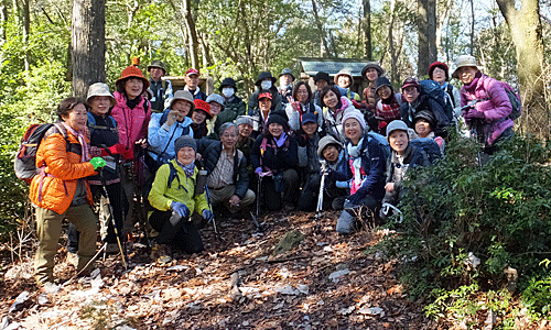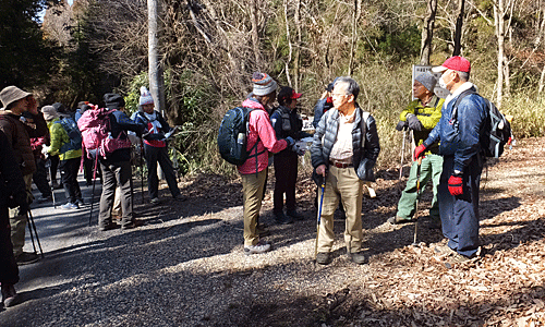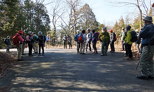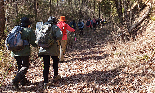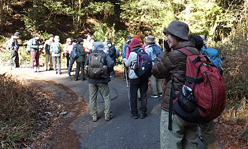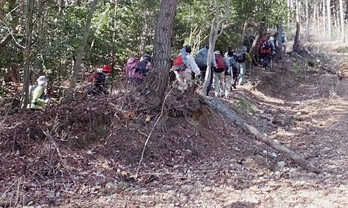 | ここがその 全員集合場所H 目印のピンクリボンから右折 このコース、 「イノシシが横切るのを見た 1人で歩くのは不安だった」・・・とか、 「先頭グループになった時、赤いテープを見つけると 見失わないうちにそこに行こうと、 つい速足になってしまった」・・・とか、 「先を歩くグループが後ろを気にしながら歩いていて、 バラバラになることなく、まとまって歩くことができた」とか 面白い道だった |