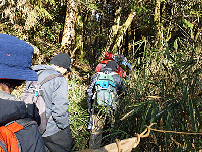 | 緩いアップダウンの後、林道に出た 14:20頃 ここが全員集合場所のI ↑↓ 林道に降りやすくするために、 鉄板を持ってもらっていて助かった〜 |