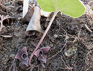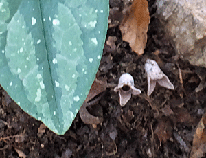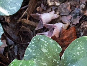 | スズカカンオイの探し方-2 その葉っぱの根元(葉柄)を そっとそっと枯葉や土をどかしていく・・・と 花が表れる ↓ |
