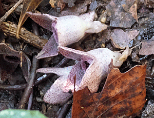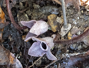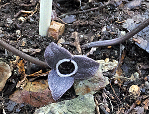 | ↑ スズカカンオイの花-1 花びらのように見えるのは、萼(がく) その萼の下に筒のようなものがある(萼筒:がくとう) 萼筒より、萼が大きいのが スズカカンアオイの特徴とか その萼は、初めつぼんでいるが、 だんだん反り返ってくる ↓ |