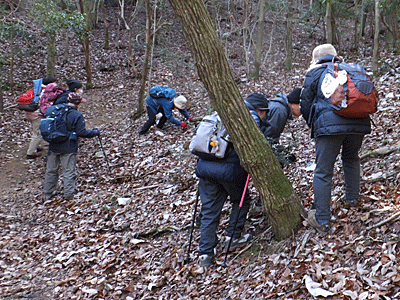 | ここから山道へ入った(全員集合場所のB) 笹が茂り、倒木があちこちにあり あるような無いような踏み跡を進んで行った 今日は、スズカカンアオイを探してもらおうと 柳箸(先が細くなって折れにくく丈夫)を ペンチで2つに折ったものを7本用意してきた 先頭の人は、前に神経を集中させるだろうから 2番手の人に箸係をしてもらい 足元を見て特徴ある葉っぱを見つけたら この箸で根元を探し、 花があったら、その箸を突き刺しておく それを最後に歩く私が回収していく・・・ことにした あるわあるわ! ↓ |