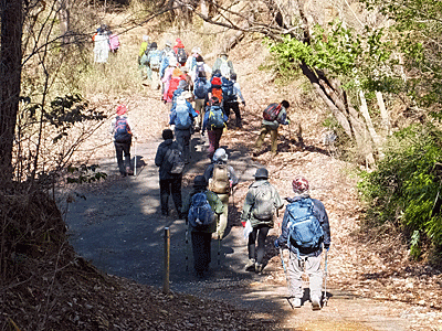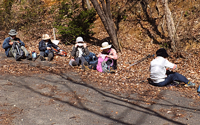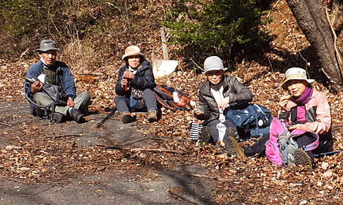 | この舗装路の所なら、べたべたしないので ランチ休憩にはまあまあの所 それぞれが日当たりの良さそうな所を選んで 腰を下ろした-1 もうこのスタイル何度もしているので 皆、慣れた様子 |