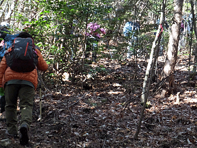 | さあ、まずは1回目の下山 赤布などがいっぱいついている 道をどんどん歩いて・・・ |