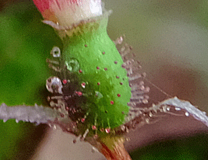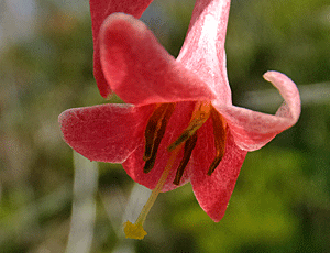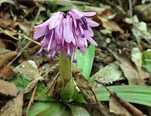 | ショウジョウバカマ:メランチウム科-1 左 全体の様子 右 雄しべの葯と雌しべのアップ 葯はまだつやつやした紫色 雌しべの先端は、半透明のガラス状 |