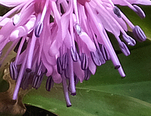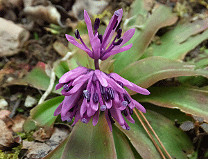 | ショウジョウバカマ:メランチウム科-3 左 全体の様子 右 雄しべの葯と雌しべのアップ 葯はまだつやつやした紫色だが、 雌しべの先端は小さくなっていた |