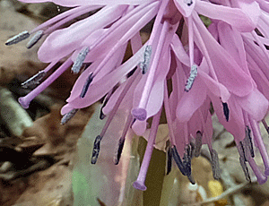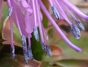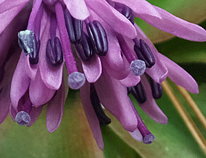 | ショウジョウバカマ:メランチウム科-4 左 全体の様子 右 雄しべの葯のアップ 花粉がいっぱい〜 |