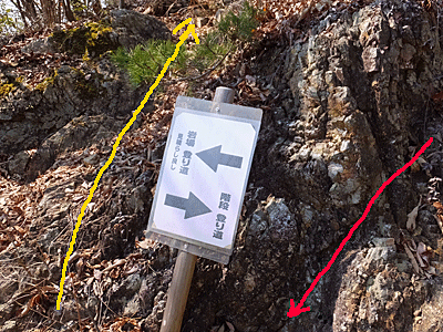 | 下り道(赤色)と登り道(黄色)の合流点 今は、「岩場登り道」と「階段登り道」になっていた |