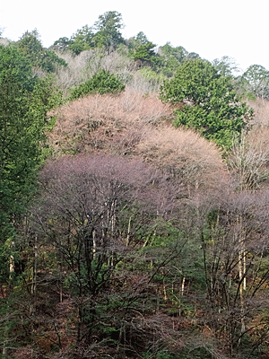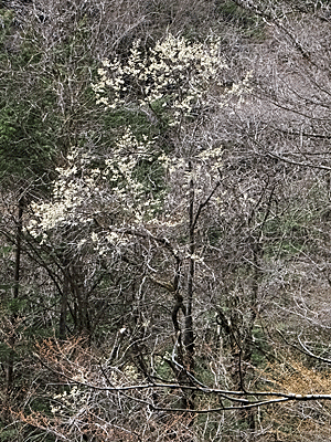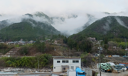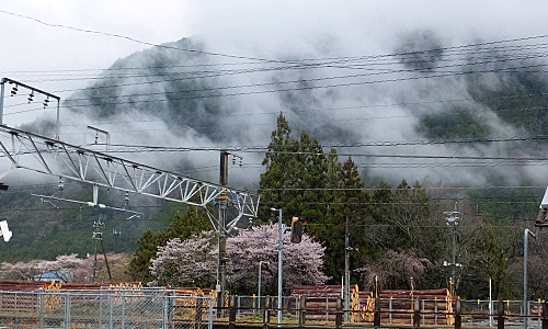 | 雲はなかなか取れないが、雨は止んでいる 車窓から山中に見えるモコモコの薄ピンクは、サクラ だんだん、満開から5分咲き→ちらほら咲きに変わっていった |