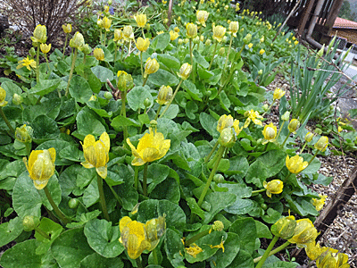 | ヒメリュウキンカ:キンポウゲ科 おやあ〜 ヒメリュウキンカの団体〜! (民家の玄関先で) |