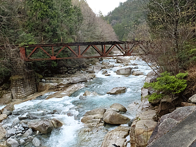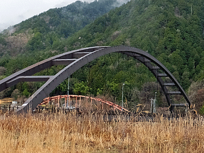 | 阿寺橋が見えてきた 7:43 赤い橋は、柿其渓谷へ行く時に渡る フォレストスパや、恋路峠へ行く道 |
