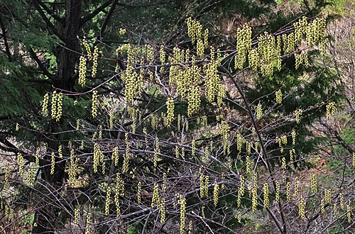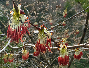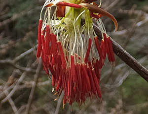 | フサザクラ:フサザクラ科 川岸に多く、山側には無かった 本当に名前の通り、赤い房状の花 花びらは無く、垂れさがっているのは「雄しべの葯」だって |