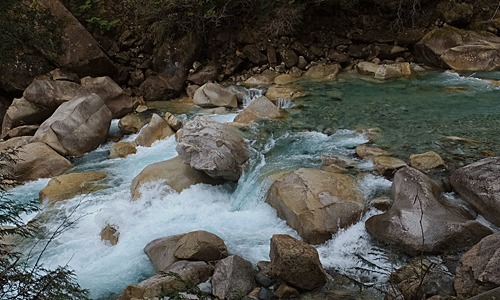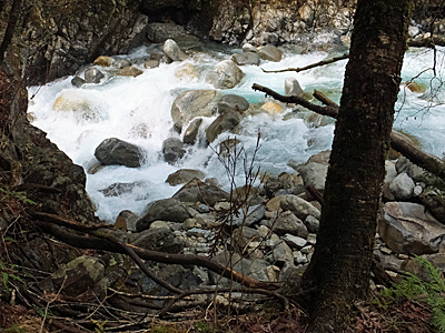 | イワウチワの大群落を期待してうなり島を目指す ここはしぶきを上げて流れる急流 |