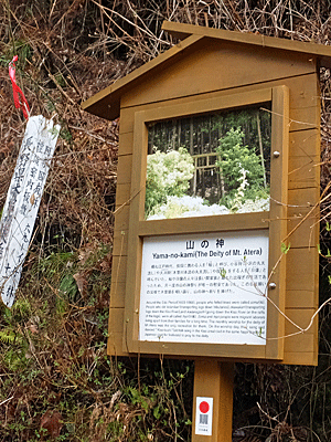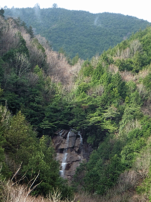 | 「雨現の滝」説明板 8:37 この説明板のずっと後ろに小さく見える ↑ |