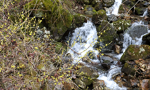 | 谷川とクスノキ科の花 ダンコウバイかな? 花柄があるかないかで見分けるそうだが こんなに離れていては無理・・・ |