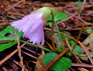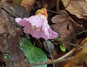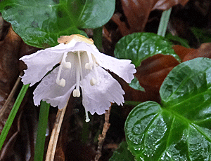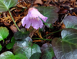 | イワウチワ:イワウメ科 滝へ下りて行く山側に小さな群落 花はまだまだ状態でこれ一つっきり |